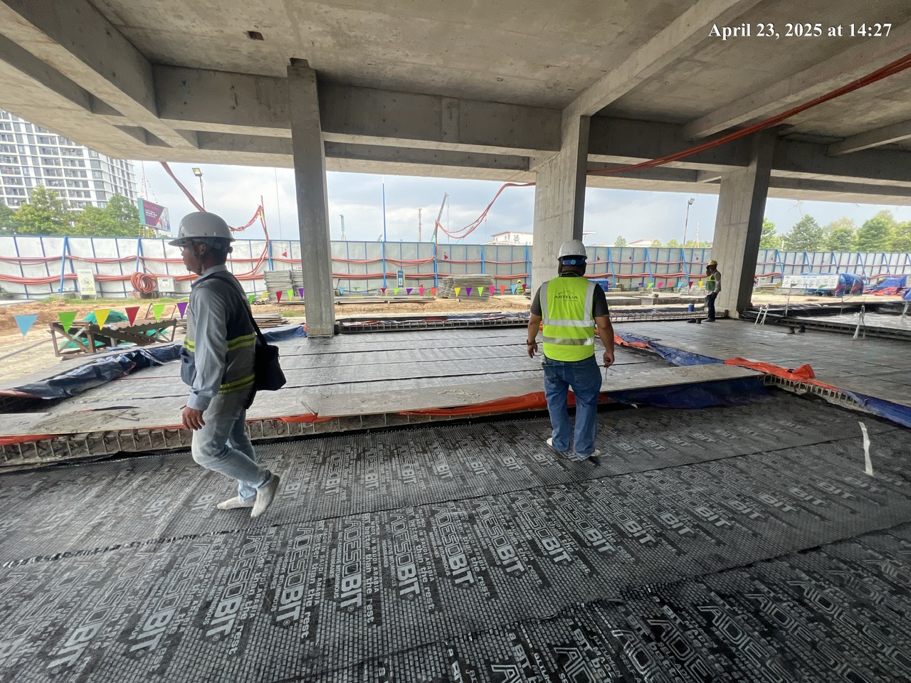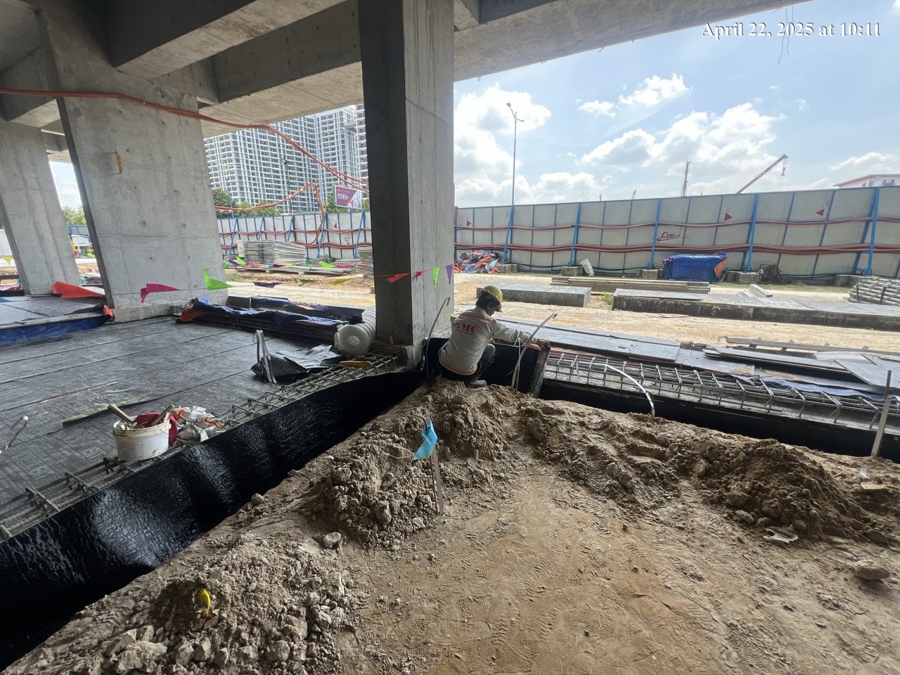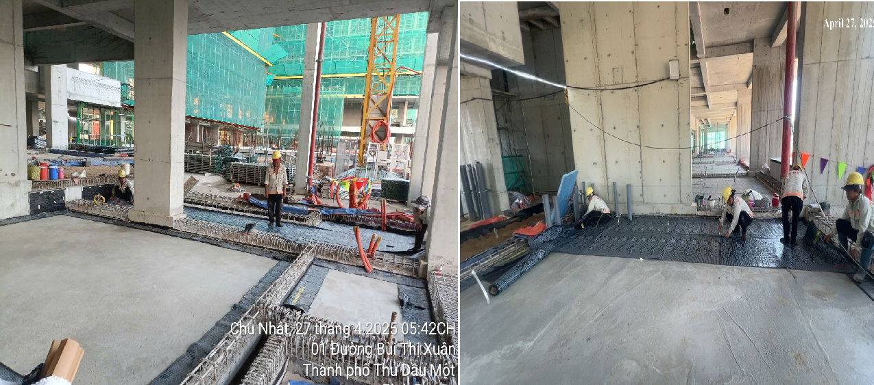 Trình bày biện pháp thi công dán màng chống thấm cho dầm và sàn tầng 1, giải thích nguyên lý hoạt động của màng tự dính và các điểm cần lưu ý trong quá trình thi công thực tế.
